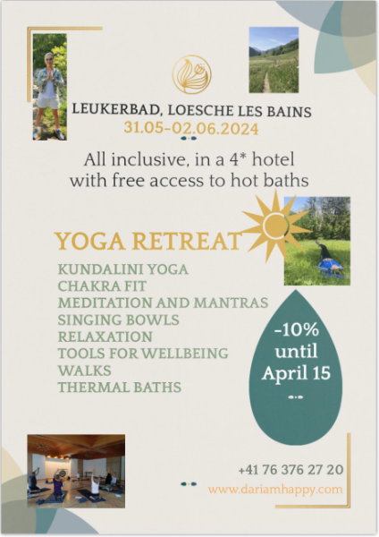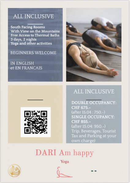 Swiss Mountain Retreat in Leukerbad: Join us for a revitalizing long weekend from May 31 to June 2, 2024, where the majestic peaks of the Swiss Alps will be our inspiring backdrop. OR Total change of scenery in Morocco: Immerse yourself in a week of discovery and relaxation in Morocco, 45 minutes from Marrakech at the foot of the Atlas Mountains, from September 5 to 11, 2024, where you can immerse yourself in the vibrant culture and captivating landscapes of this magnificent country. Suitable for beginners as to advanced